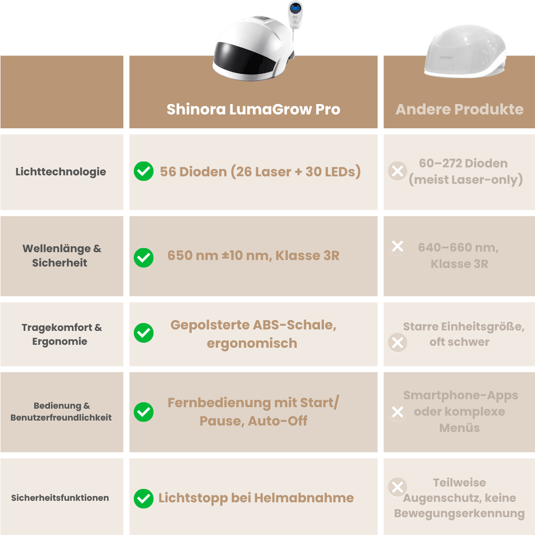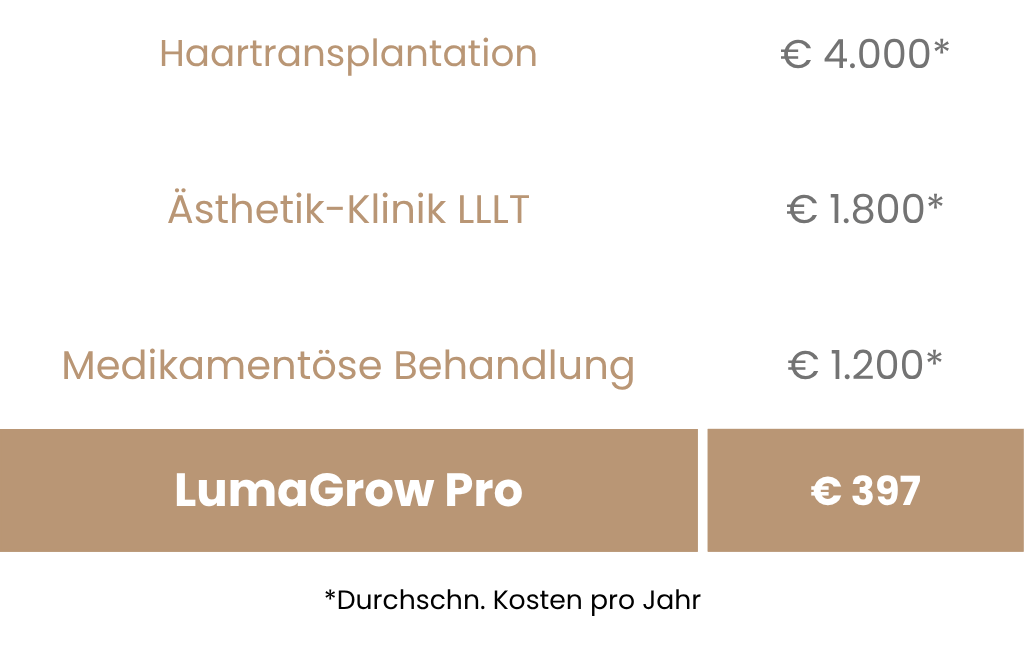 Warum jeden Monat Hunderte Euro für Klinikbesuche oder Medikamente ausgeben, wenn du mit dem LumaGrow Pro bequem zu Hause starten kannst? Er unterstützt dein Haarwachstum – und das zu einem Bruchteil der Kosten vergleichbarer Methoden.