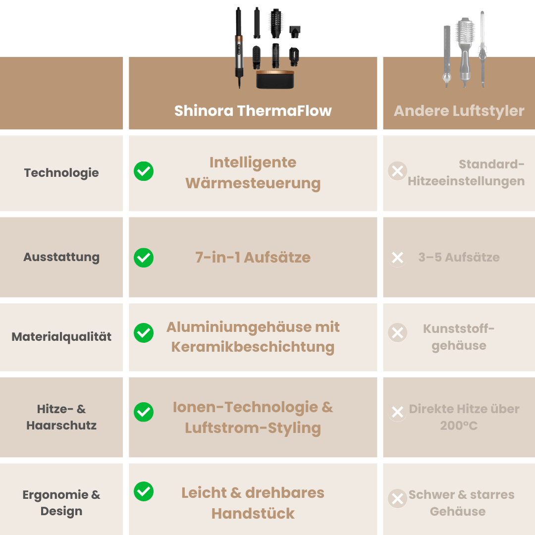 Der ThermaFlow ersetzt mehrere Geräte, ist schonender zum Haar und spart dir Zeit. Statt Kompromisse bei Billigtools einzugehen, bekommst du ein hochwertiges Styling-Erlebnis mit echtem Mehrwert.