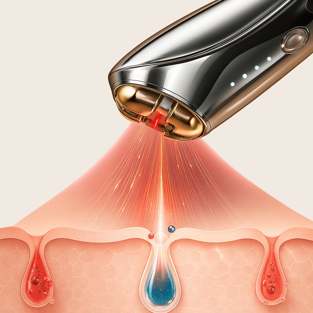 Blaues Licht beruhigt und klärt, rotes Licht regeneriert und belebt. Gemeinsam verfeinern sie die Hautstruktur, regulieren Talg und bringen den natürlichen Glow zurück.