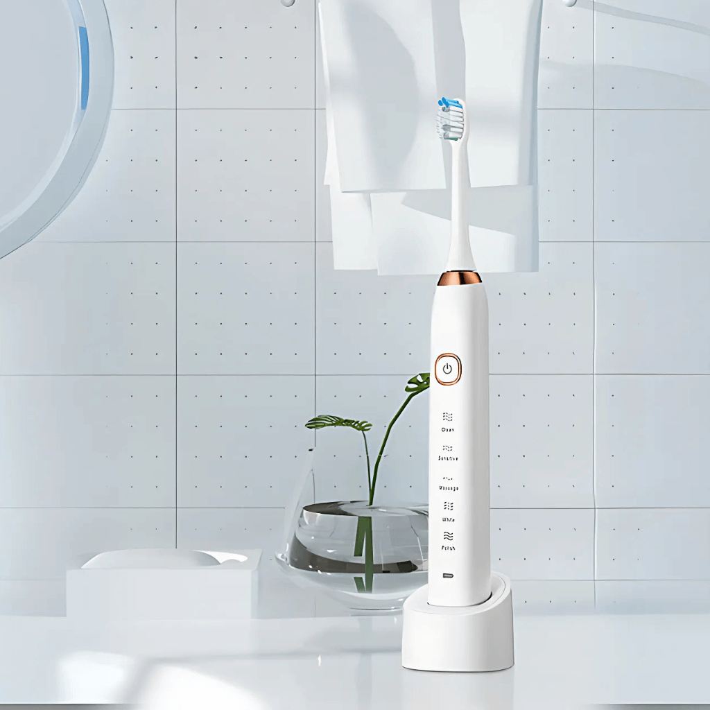 Tannbørsten lades trådløst via ladebasen. Bare sett den i basen – ingen plugging inn eller ut. Trygt, praktisk og hygienisk.