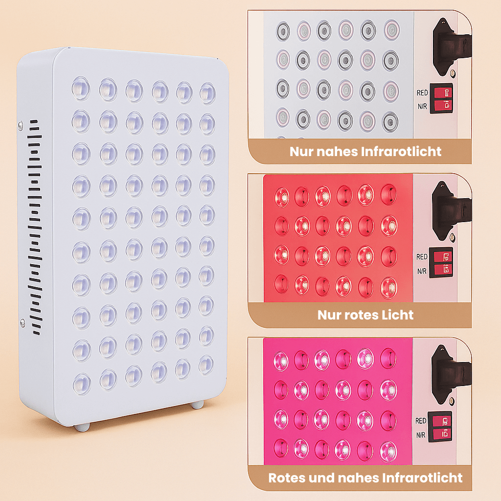 Wechsle mit einem Knopfdruck zwischen 660 nm Rotlicht, 850 nm Nahinfrarot oder dem Kombi-Modus. So passt du jede Anwendung genau deinen Bedürfnissen an – von kollagenfördernder Hautverjüngung bis hin zu tiefenwirksamem Schmerz- und Spannungsabbau.