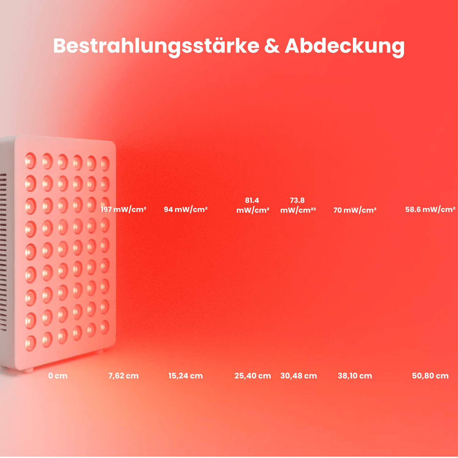 Diese Übersicht zeigt, wie das Panel kraftvolle, therapeutische Energie genau dort abgibt, wo Ihr Körper sie braucht. Von intensiven 197 mW/cm² aus nächster Nähe bis hin zu starken 58,6 mW/cm² selbst auf 50 cm Abstand erhalten Sie eine gleichbleibende, wissenschaftlich fundierte Lichtdosierung für glattere Haut, weniger Schmerzen und schnellere Regeneration – ganz ohne unbequem nah an der Lampe sitzen zu müssen.